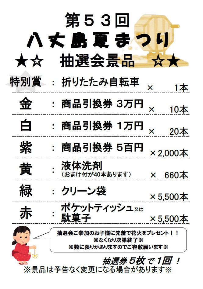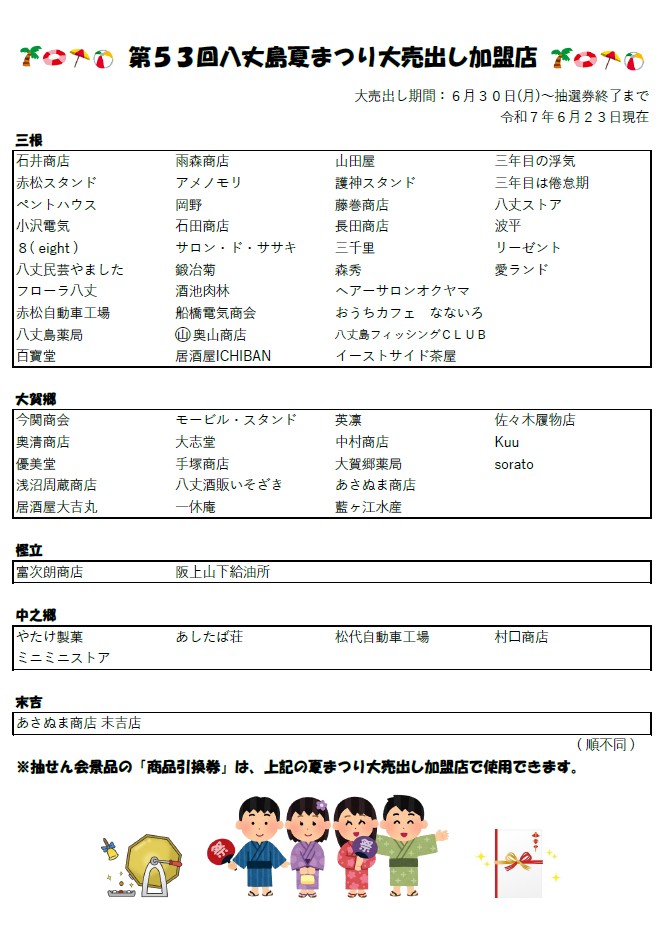 6月30日(月)~抽選券が無くなるまでを夏まつり大売出し期間として、会場で抽選(ガラガラ)ができる抽選券を加盟店にて配布しています。